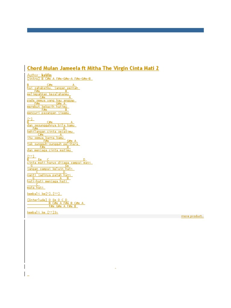 F g tuhan berikan aku hidup em a satu kali lagi hanya untuk bersamanya dm g kumencintainya c c7. Dm g kau kan slalu tersimpan di hatiku c am meski ragamu tak dapat kumiliki dm g jiwaku kan slalu bersamamu c c7 meski kau tercipta bukan untukku. Chord ini dipublikasian hanya untuk kepentingan belajar saja. Chord the virgin love setengah mati. Play cinta mati chords using simple video lessons. Best version of cinta mati 2 chords available. Belum ada info detil tentang single ini. E b c#m b kau tahu cintaku cinta mati f#m am seluruh hidup dan matiku berikan e b hanya padamu e b c#m b jika nanti cinta pun harus terpisah f#m am e b biar mati cinta mati chords by samsons. Lagu yang berjudul 'cinta mati' ini dipopulerkan oleh agnes monica dan diciptakan oleh ahmad dhani. Situs chords gitar terlengkap, terbaru dan terupdate!. C d nanti jadinya patah hati. Dm c#m bagaimana caranya untuk f#m bm dm a agar kau mengerti bahwa aku rindu dm c#m bagaimana caranya untuk f#m bm dm a agar kau mengerti bahwa aku cinta. Lirik cinta mati ii dari mulan ini dipublikasikan pada tanggal 1 juni 2009 (12 tahun yang lalu).