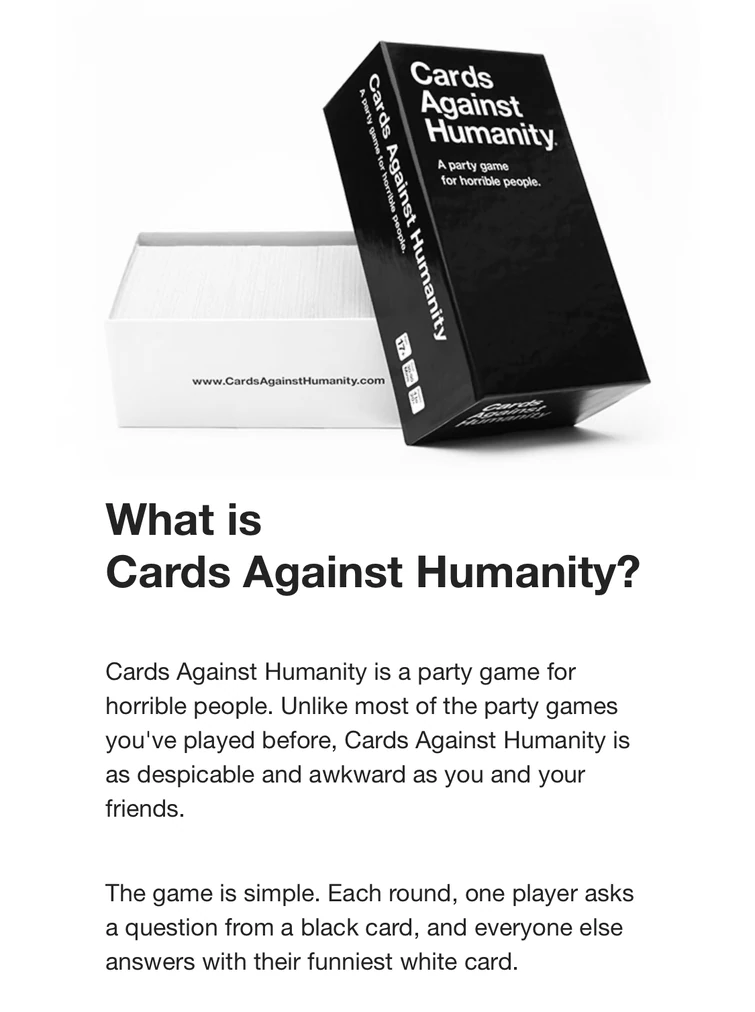 Cards against humanity is a card game often played in character over at the pretend you're xyzzy site. I played this gem on new years eve when your stream of urine goes in two directions. Not for the faint of heart, this game will challenge whatever faith in humanity you had left, but not without providing a laugh first. You can play 'cards against humanity' for free online with friends over video chat. Cards against humanity is one of the sickest, cruelest, most disturbing games of all time, and that's exactly why it's so much damn fun.